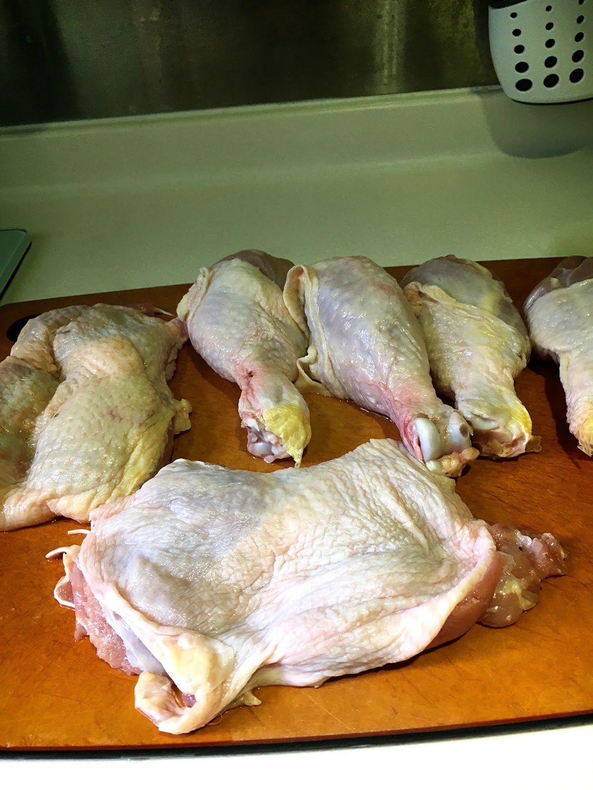 1. 雞扒及雞膇解凍、洗淨,用厨房紙抹乾水份;雞扒切件;雞槌用小刀上面切開,將肉和骨分開,將雞肉推向另至一邊露出膇骨。